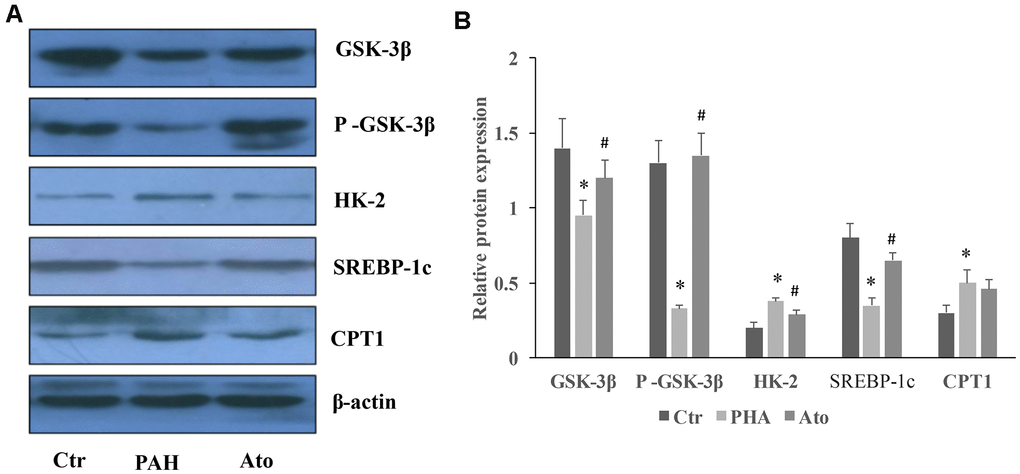 The levels of GSK-3β, p-GSK-3β, and SERBP-1c were significantly suppressed by MCT in the group PAH, but the concentrations of HK-2 and CPT-1 were promoted (Figure 6A, 6B). However, Ato could remarkably reversed the influence of MCT by increasing GSK-3β, p-GSK-3β, and SERBP-1c, and decreasing HK-2 and CPT-1 (Figure 6A, 6B).