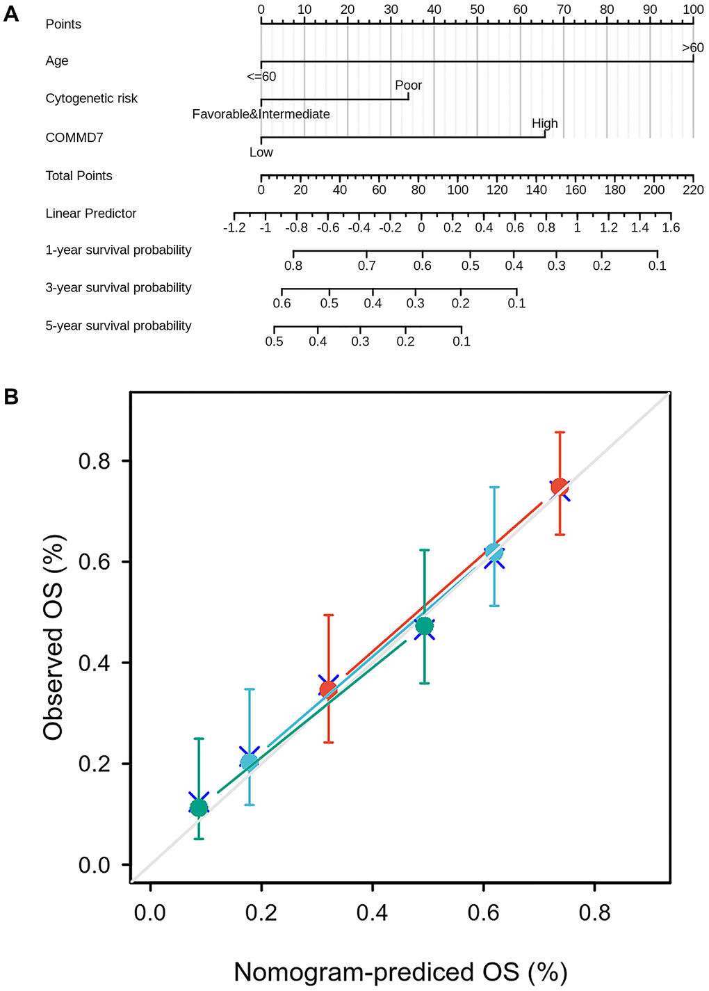 It is worth noting that the most clinically relevant finding was that high expression of COMMD7 was associated with poor survival. Multivariate Cox regression analysis showed that high expression of COMMD7 was another independent prognostic factor besides age (>60 years). The establishment of the nomogram prediction model further confirmed the predictive effect of COMMD7 expression on prognosis. Therefore, COMMD7 may serve as a new adverse prognostic factor in AML patients.