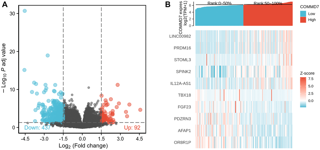 The high- and low-expression groups' gene expression profiles were analyzed for differences in the median mRNA expression. A total of 529 DEGs from gene expression RNA-seq-HTSeq-Counts, including 92 up-regulated and 437 down-regulated, were identified statistically significant between COMMD7 high- and low-expressed groups (|log fold change (logFC)| > 1.5, P < 0.05) (Figure 2A). The top five up-regulated DEGs and top five down-regulated DEGs between COMMD7 high- and low-expressed groups were illustrated by the heat map (Figure 2B).
