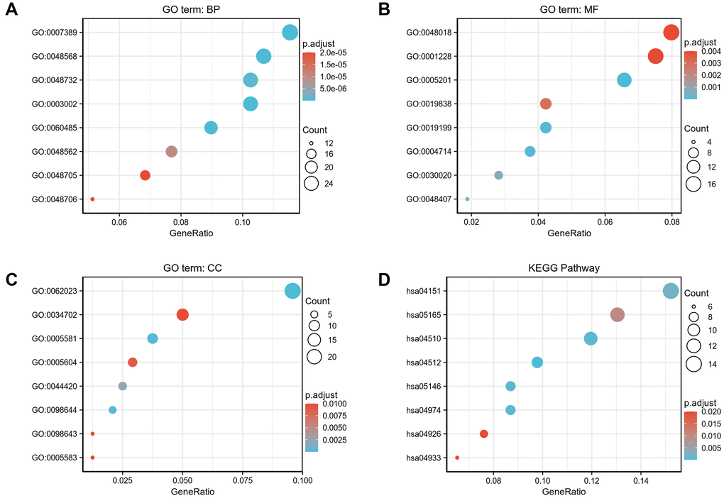 DEGs with the threshold for |logFC| >1.5 and padj <0.05 were applied for functional enrichment analysis. Gene Ontology (GO) functional analysis comprising cellular component (CC), molecular function (MF), and biological process (BP), as well as Kyoto Encyclopedia of Genes and Genomes (KEGG) pathway analysis, were implemented using the ClusteProfiler package in R [15].