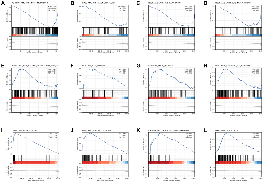 GSEA analysis was conducted to gain further insight into the biologic pathways involved in AML with different COMMD7 expression levels. GSEA was performed between low- and high-COMMD7 expression datasets to identify critical signaling pathways involved in AML. Significant differences (FDR < 0.05, ADJ P < 0.05) were observed in the enrichment of MSigDB Collection (C2.all.v7.0.symbols.gmt) of these pathways (Supplementary Table 2 and Figure 4). Gene mutations or fusions with a good prognosis of AML, such as PML-RARa fusion, NPM1 mutation, AML-ETO fusion, and CBFB-MYH11 fusion, were enriched in COMMD7 low- expression phenotype based on NES, with adjusted P value <0.05 and FDR value <0.05 (Figure 4A–4D). On the contrary, in the high expression of COMMD7 phenotypes, factors with poor prognosis in AML, such as FLT3-ITD fusion and MLL fusion, presented significantly enriched (Figure 4I–4J). So did the pathways involved in AML and other tumor development, such as MAPK, RAS, Hedgehog, and Wnt pathways (Figure 4E–4H). Other genetic variants, such as phosphorylated TP53 targets and MYC targets, were also significantly enriched in such phenotype (Figure 4K–4L).