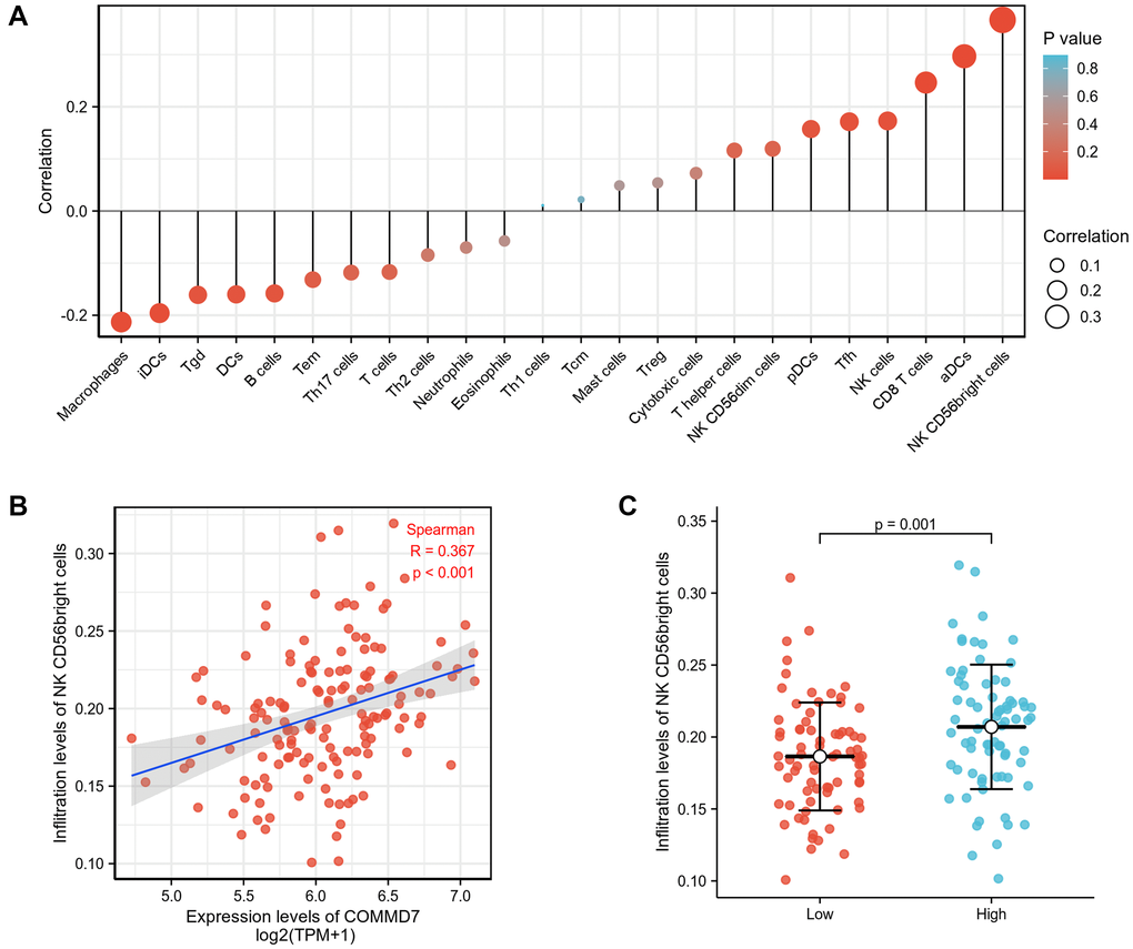 Spearman correlation analysis showed that the expression level of COMMD7 in the AML microenvironment was correlated with the immune cell infiltration level quantified by SSGSEA. Specifically, COMMD7 was positively associated with NK CD56bright cells and active dendritic cells (aDCs) (Figure 5).