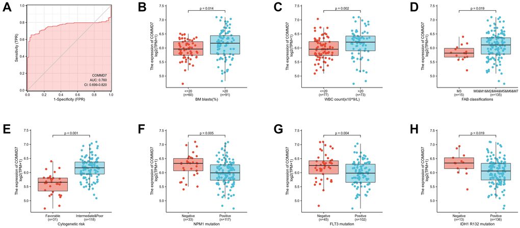 Logistic analysis was applied to further verify the relationship between AML clinicopathological factors and the COMMD7 high-low dichotomy. As a result, high expression of COMMD7 showed a significant positive correlation with high WBC count (>20 × 109/L) (odds ratio [OR], 3.16; P < 0.001) and high PB blasts (>70%) (OR, 2.89; P = 0.002), whereas negatively correlated with FLT3 mutation (OR, 0.32; P = 0.002) and NPM1 mutation (OR, 0.34; P = 0.01) (Table 2). What is more, the potential value of COMMD7 in differentiating AML patients from healthy individuals was examined by ROC curve analysis, with the AUC of 0.760, revealing that COMMD7 had potential as a biomarker (Figure 7A). Besides, the Wilcoxon Rank SUM test was used to compare the expression of COMMD7 in patients with different clinicopathological features. The result showed that COMMD7 was significantly high-expressed in the patients with BM blasts (>20%; P = 0.014), WBC counts (>20 × 109/L; P = 0.002), FAB classification (non-M3 type; P = 0.019), cytogenetics risk (intermediate/poor; P < 0.001), NPM1 mutation (negative; P = 0.005), FLT3 mutation (negative; P = 0.004), and IDH1 R132 mutation (negative; P = 0.019) (Figure 7B–7H).