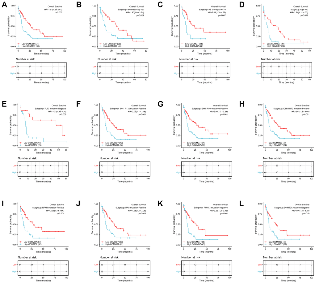 The relationship between COMMD7 expression and prognosis was analyzed in AML patients by using Kaplan-Meier. As seen in Figure 8A, patients with high expression of COMMD7 had a strongly worse prognosis than those with low COMMD7 expression (hazard ratio [HR], 1.91(1.25-2.93); P = 0.003). Kaplan-Meier analysis presented that high expressed COMMD7 correlated with poor prognosis in the subgroups of BM blasts≥ 20% (P = 0.024), PB blasts ≤ 70% (P = 0.007), age >60 (P = 0.009), FLT3 mutation negative (P = 0.009), IDH1 R132 mutation positive (P = 0.001), R140 mutation positive (P = 0.002), R172 mutation positive (P = 0.001), NPM1 mutation positive (P < 0.001), RAS mutation positive (P = 0.002), RUX1 mutation negative (P = 0.004), and DNMT3A mutation negative (P = 0.019) (Figure 8B–8L).