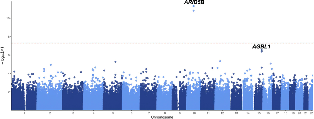 To investigate the inherited predispositions to ALL in the Chinese population, GWAS was performed with all imputed SNPs after stringently filtering. A total of 1,466 non-ALL controls and 466 B-linage ALL patients were included in this study with baseline characteristics illustrated in Table 1, including 381 pediatric (< 14 yrs] and 85 adult patients (≥ 14yrs). For childhood ALL (< 14yrs), only one locus (i.e., ARID5B) reached genome-wide significance (P < 5 × 10-8) (Figure 1), suggesting no novel strong genetic predisposition to ALL in the Chinese population with current sample size. Subsequently, we retrieved the association results for all 21 SNPs at 17 reported loci from ALL patients and non-ALL controls. In pediatric patients, a total of 7 SNPs at 6 loci were significantly associated with ALL susceptibility regardless of molecular subtypes, including SNPs at ARID5B, IKZF1, BMI-PIP4K2A, CEBPE, CDKN2B-AS1, and BAK1 (Table 2). The top signal at ARID5B was rs7090445 (P = 2.7 × 10-14, Odds ratio [OR] = 1.96, [95% CI: 1.60-2.24]), which was reported as the potential causal variant for ARID5B locus. rs11770117 (P = 0.03, OR = 1.27 [1.01-1.62]) at IKZF1 locus exhibited independent association with ALL susceptibility even after adjusting for the top signal at IKZF1 locus (i.e., rs11978267, P = 0.003, OR = 1.40 [1.12-1.75]) with Padjust = 0.04, which is consistent with previous observation in Hispanics [8]. Additionally, rs4266962 (P = 0.01, OR = 1.64 [1.11-2.43]) also exhibited significance independent of rs7088318 at BMI-PIP4K2A locus. Among three recently identified loci with a large sample size of the Caucasian population, only rs210143 (P = 0.007, OR = 1.41 [1.10-1.81]) at BAK1 locus can be validated in our Chinese patients (Table 2), indicating ethnicity-specific and shared mechanism of leukemogenesis. However, in adult patients, only SNPs at GATA3 locus (rs3824662) exhibited significant association with ALL susceptibility (P = 0.0005, OR = 1.79 [1.29-2.50]) (Table 2), suggesting the different genetic basis of adult from pediatric patients.