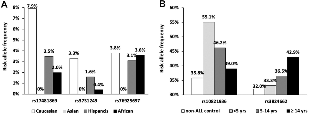 Since the significance of some GWAS signals is greatly impacted by clinical features, we thus estimated their associations with ALL susceptibility in Chinese patients considering ethnicity, age, and molecular subtype. The best example for ethnic specificity is the causal missense variant (i.e., rs3731249) in CDKN2A. Risk allele frequency (RAF) of rs3731249 is absent (0%) in our cohort, which is consistent with that in a public database (i.e., 0% in East Asian vs. 3.3% in Caucasians according to gnomAD [34]) (Figure 2A), and thus perfectly explain the racial difference at this locus. The insignificance of rs17481869 at 2q22.3 locus and rs76925697 at 9q21.31 locus can also be explained by ethnicity specific risk allele frequency. In pediatric ALL patients, the novel Hispanic-specific ALL risk signal at ERG locus exhibited marginally significant association with ALL susceptibility in Chinese patients (P = 0.07, OR = 1.18 [0.99-1.41]), and reached statistical significance in patients without common fusion (P = 0.02, OR = 1.29 [1.04-1.61]), which has been validated in previous study [28]. However, rs1121404 (P = 0.34, OR = 1.13 [0.88-1.45]) at WWOW identified in Chinese specific GWAS cannot be validated in our cohort. Association analysis was next performed in different genetic subtypes. Although association of rs7088318 at BMI-PIP4K2A locus with ALL susceptibility did not reach statistical significance in the whole patient cohort (P = 0.21, OR = 1.11 [0.94-1.31]), risk allele of this SNP was enriched in B-ALL patients with no common fusions (P = 0.05, OR = 1.21 [1.00-1.49]). Similarly, rs35837782 at hyperdiploid-specific LHPP locus exhibited marginally significant association with ALL susceptibility in the whole cohort (P = 0.09, OR = 1.17 [0.98-1.40]), but achieved statistical significance in B-ALL patient with no common fusions (P = 0.04, OR = 1.23 [1.00-1.51]), which is also observed for rs2836365 in ERG (P = 0.02, OR = 1.29 [1.04-1.61]). Consistent with the observation in Hispanics [13], an enriched risk allele of rs2836365 was observed in the TCF3-PBX1 subtype at rs2836365. In contrast, ETV6-RUNX1 subtype specific SNPs rs10853104 at IGF2BP1 locus (P = 0.53, OR = 1.08 [0.84-1.39]) at 17q21.32 cannot be validated in our cohort even after considering different subtypes.