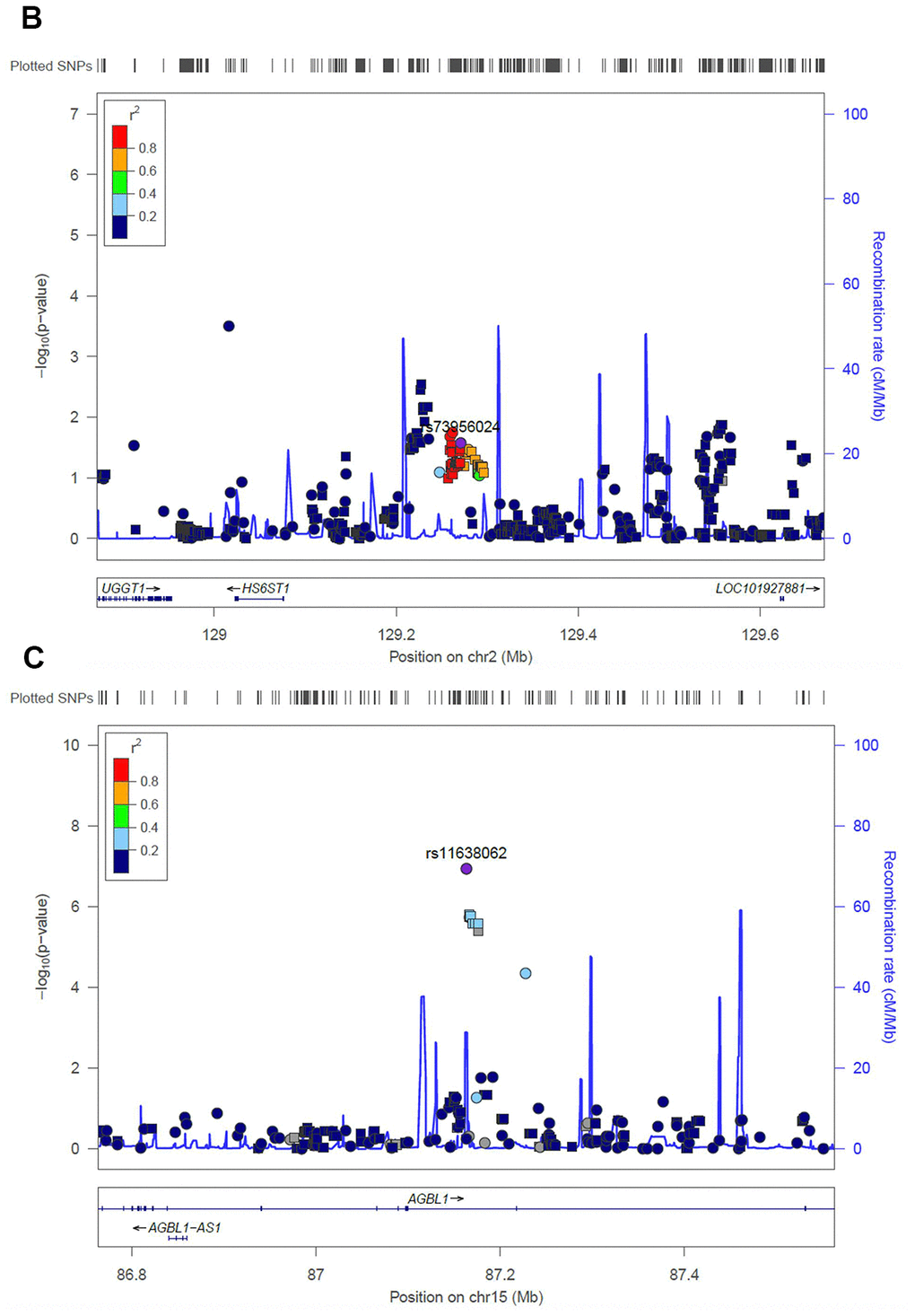 | rs16977928 | 15:86684441 | AGBL1 | 0.0003 | 1.80 (1.31-2.48) | 0.023 | 1.94 (1.09-3.43) | 2.3×10-5 | 1.90 (1.41-2.56) | 0.97 | 1.01 (0.55-1.85) | |||||||||||||||||||||||||||||||||||||||||||||||||||||||||||||||||||||||||||||||||||||||||
