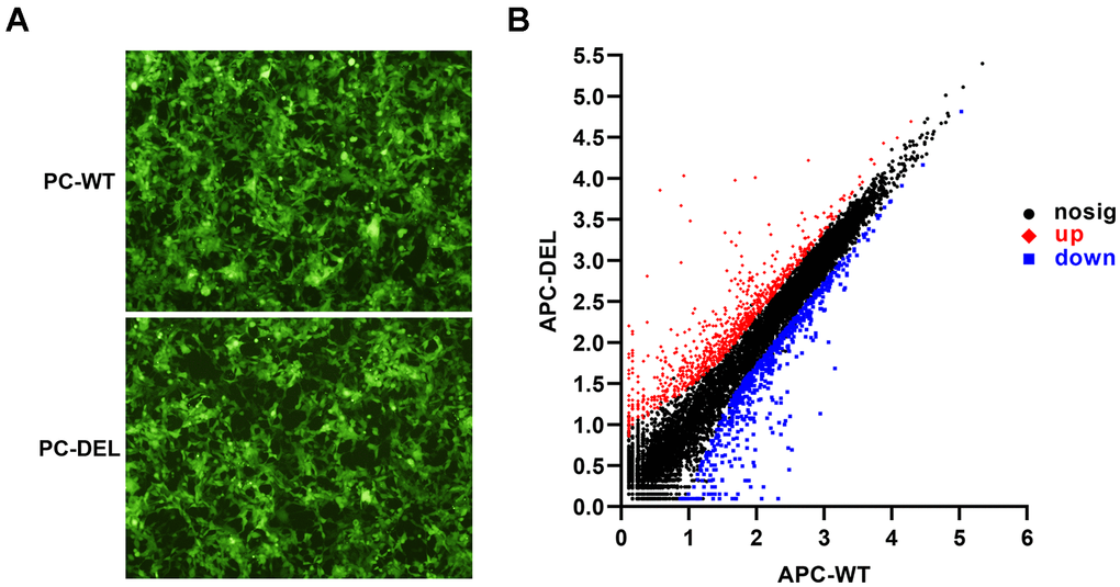 HEK 293T cells expressing wild or mutant PC zymogen and green fluorescent protein (GFP) were screened. The GFP-positive clones were observed under the microscope as a reference for the efficacy of two transfections (Figure 1A). Transcriptome analysis of HEK 293T cells treated with wild or mutant APC (APC-WT and APC-DEL) revealed genetic alterations in two transformants. A total of 1,484 differentially expressed genes (DEGs) were identified with 831 genes upregulated and 653 genes downregulated in the mutant APC group (adjusted P < 0.01 and log2FC ≥ 1 or ≤ −1) (Figure 1B).