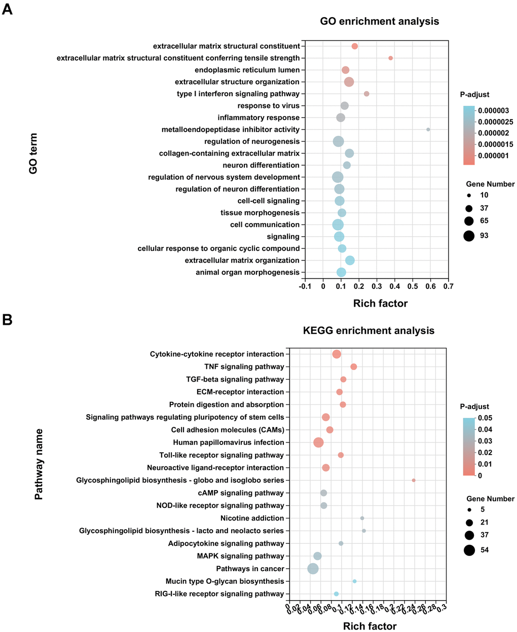 Figure 2A showed the top 20 Gene Oncology (GO) enrichment analysis terms. Metalloendopeptidase inhibitor activity displayed the strongest enrichment score with the highest rich factor (0.59), followed by an extracellular matrix structural constituent conferring tensile strength (rich factor: 0.38). Extracellular structure organization, tissue morphogenesis, virus-related immune responses, inflammatory response, nervous system development, and cell–cell communications were additional enriched biological processes. The Kyoto Encyclopedia of Genes and Genomes (KEGG) pathway analysis of DEGs revealed 20 signaling pathways (adjusted P < 0.05), of which 11 pathways, mainly enriched in biological metabolism, interaction and transduction of signaling molecules, and responses to viral infection, displayed substantial differences (adjusted P < 0.01) (Figure 2B).