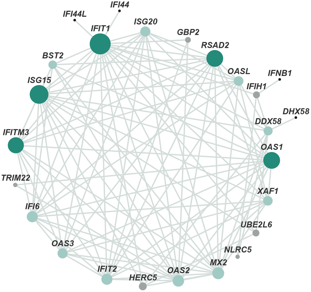In addition, the identified protein–protein interaction (PPI) networks consisted of 300 relationships (edges) and 205 genes (nodes) (Figure 3). IFIT1, ISG15, RSAD2, OAS1, and IFITM3, factors that regulate the generation of type I interferon (IFN) and immune responses to viruses, such as inhibition of virus proliferation and elimination of virus-infected cells, constituted networks with high degree of centrality. These results, except for virus-defense responses, were consistent with those of previous studies that implicated APC in development [5], anti-inflammatory and anti-apoptotic activities [2, 4], and neuroprotection [11].