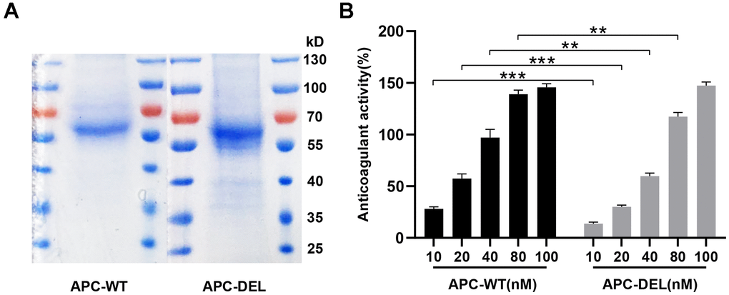 Antigen concentrations of APC-WT and APC-DEL were detected by Human Protein C ELISA Kit and were adjusted to consistent levels (10–100 nM) by PBS. The anticoagulant activity of APC-WT and APC-DEL was measured using a chromogenic substrate with a HEMOCLOT Protein C kit on an automated coagulation analyzer (Diagnostica Stago, France), as described previously [13].
