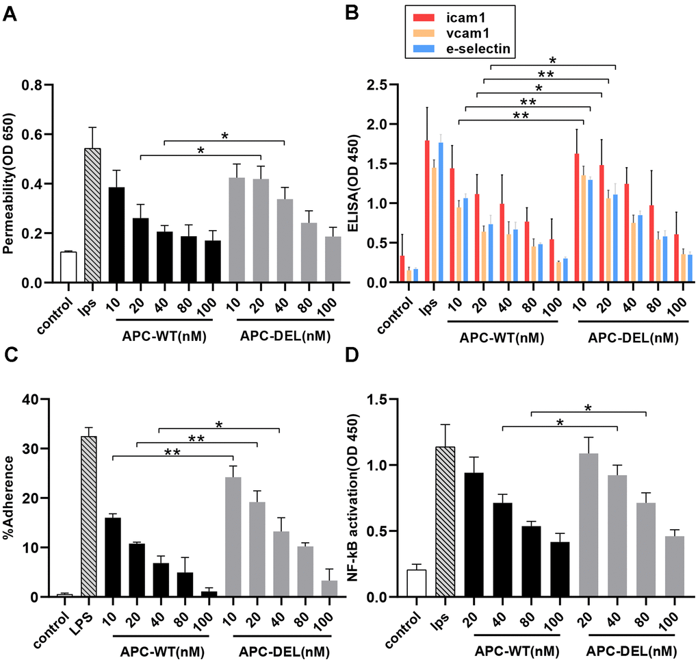 We next evaluated the effect of APC on the expression of cell adhesion molecules, namely intercellular adhesion molecule-1 (ICAM-1), vascular cell adhesion molecule-1 (VCAM-1), and E-selectin on the surface of endothelial cells. Both APC-WT (10 nM) and APC-DEL (40 nM) inhibited the proinflammatory function of LPS and the cell surface expression of these adhesion molecules. At 40 nM and higher concentrations, APC-DEL exhibited inhibiting capacities similar to those of APC-WT (Figure 5B). The reduced expression of adhesion molecules correlated with the decreased binding of THP-1 cells to LPS-activated endothelial cells. Compared with APC-WT, the inhibitory effect of APC-DEL on leukocyte infiltration was less, about 50.9 ± 8.8%, 61.7 ± 7.1%, and 74.4 ± 8.9% of that of APC-WT (at 10 nM, 20 nM, and 40 nM, respectively). Compared with the LPS-free group, both APC-WT and APC-DEL reduced the adhesion of THP-1 cells at higher concentrations (Figure 5C).