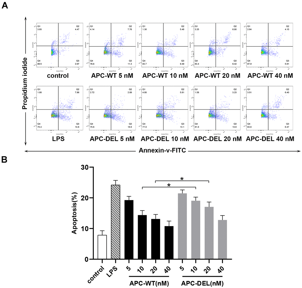 The cytoprotective effects of APC were determined by inducing apoptosis in HUVECs by staurosporine [17]. Briefly, cells were incubated with APC (5–40 nM) for 5 h before treatment with staurosporine (10 μM, 1 h). Thereafter, viable and apoptotic cells were determined using the Annexin V-FITC apoptosis detection kit following the manufacturer’s protocol.