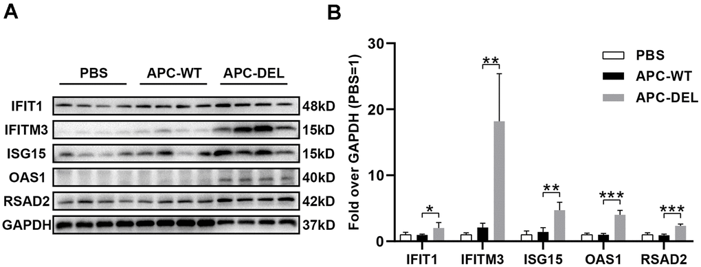 Total cellular lysates were prepared from lung tissues using RIPA lysis buffer containing 1% protease inhibitor cocktail. Protein samples were separated on 10% SDS-PAGE gels (30 μg per lane). The proteins were transferred onto polyvinylidene difluoride (PVDF) membranes. Afterward, the membranes were blocked with 5% nonfat milk for 1 h and incubated overnight at 4° C with primary antibodies against IFIT1, IFITM3, ISG15, OAS1, RSAD2 and GAPDH (1:1000 for each antibody) followed by incubation with secondary IgG antibody (1:3000) for 1 h. The ECL reagent was used to visualize the target bands; the intensity value of each band was quantified by the Image J software. The expressions of IFIT1, IFITM3, ISG15, OAS1, and RSAD2 relative to GAPDH were determined for all samples.