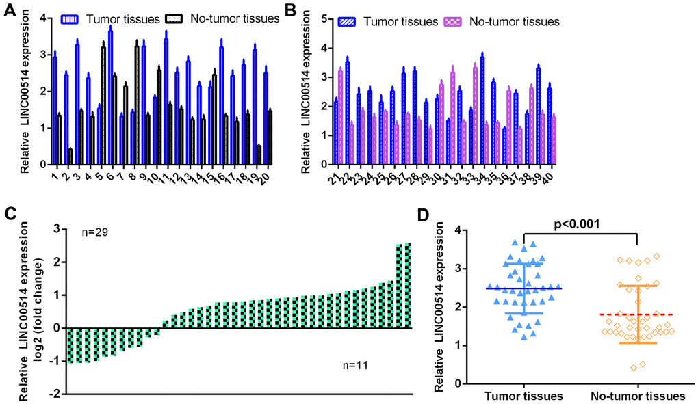 First, the level of LINC00514 was detected using qRT-PCR in 40 pairs of GC specimens and paired control nontumor specimens. As illustrated in Figure 1A, 1B, the expression of LINC00514 in 40 pairs of GC specimens and paired control nontumor specimens is indicated. LINC00514 was overexpressed in 29 cases (29/40, 72.5%) compared to paired control nontumor specimens (Figure 1C). LINC00514 expression was upregulated in GC specimens compared with nontumor specimens (Figure 1D).