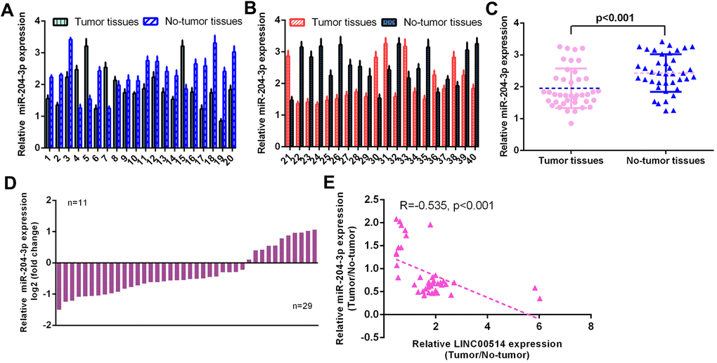 Then, the level of miR-204-3p was determined using qRT-PCR in 40 pairs of GC specimens and paired control nontumor specimens. The expression of miR-204-3p in 40 pairs of GC specimens and paired control nontumor specimens is illustrated in Figure 2A, 2B. The expression of miR-204-3p was decreased compared to paired control nontumor specimens in 29 cases (29/40, 72.5%) (Figure 2C). miR-204-3p expression was downregulated in GC specimens compared with nontumor specimens (Figure 2D). LINC00514 expression was negatively correlated with miR-204-3p expression in GC specimens (Figure 2E).