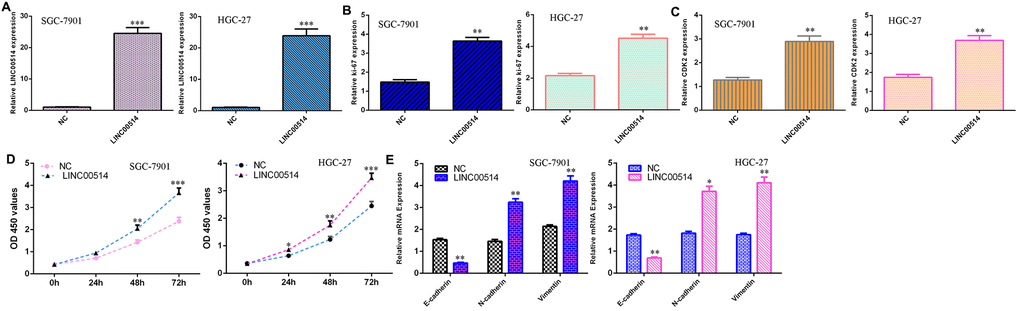 The level of LINC00514 was overexpressed in both SGC-7901 and HGC-27 cells after transfection with pcDNA-LINC00514 (Figure 3A). Elevated LINC00514 expression increased Ki-67 expression in both SGC-7901 and HGC-27 cells (Figure 3B). Overexpression of LINC00514 enhanced CDK2 expression in both SGC-7901 and HGC-27 cells (Figure 3C). Overexpression of LINC00514 induced cell growth in both SGC-7901 and HGC-27 cells (Figure 3D). Ectopic expression of LINC00514 inhibited expression of E-cadherin and increased vimentin and N-cadherin expression (Figure 3E).