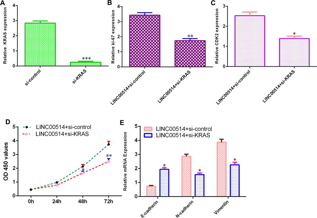 Downregulation of KRAS inhibited Ki-67 expression (Figure 5B) and CDK2 expression (Figure 5C) in LINC00514-overexpressing HGC-27 cells. Knockdown of KRAS inhibited cell growth in LINC00514-overexpressing HGC-27 cells (Figure 5D). Downregulation of KRAS promoted E-cadherin expression and decreased N-cadherin and vimentin expression (Figure 5E).