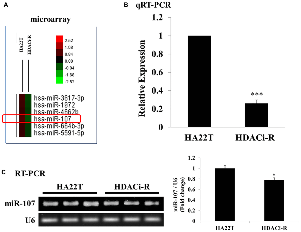 Expression of miR-107 decreased in HDACi-resistance HCC cells compared to parental cells