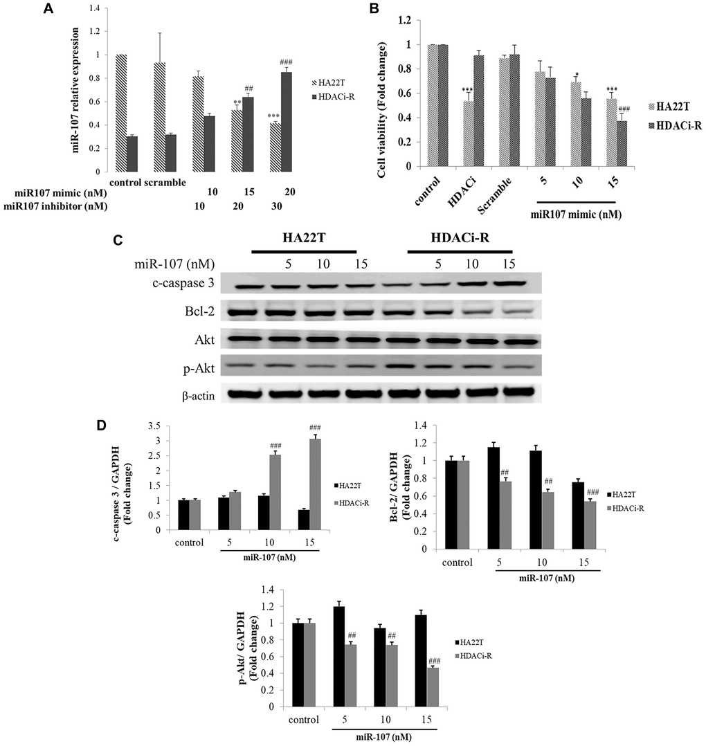 Figure 1 shows that the expression of miR-107 was downregulated in HDACi-resistant cells. Following this, we determined the role of miR-107 in chemoresistance in two HCC cells using transfected miR-107 mimic and miR-107 antisense (inhibitor). Initially, we examined whether miR-107 expression changes after transfection of HDACi-R and HA22T cells with a mimic or an inhibitor of miR107, respectively. Figure 2A shows a lower miR-107 expression in HDACi-R compared to HA22T in control, untransfected cells. The expression of miR-107 was upregulated after transfection with the mimic in HDACi-R cells and was downregulated after knockdown of miR-107 using transfection of inhibitor in parental cells in a dose-dependent manner. Further, we investigated whether miR-107 induces HCC cell apoptosis. The results of the MTT assay showed that HDACi induced cell death only in HA22T cells, and that upregulation of miR-107 in HA22T and HDACi-R cells decreased cell viability (Figure 2B). Moreover, we observed that the upregulation of miRNA could induce apoptosis-related proteins such as cleaved caspase-3 (c-caspase-3) and decrease pro-survival-related proteins such as Bcl-2 and p-Akt expression in HDACi-R and HA22T cells, as confirmed by western blotting analysis (Figure 2C) and quantification (Figure 2D). Importantly, Figure 2B–2D show that miR-107 regulated cell viability and expression of apoptosis-related and pro-survival-related proteins, especially in HDACi-R cells. Interestingly, comparing the protein basal levels of the two cell lines, resistant cells have a lower caspase 3 and Bcl-2 and a higher p-Akt expression, compared to HA22T. We also noticed that overexpressed miR-107 decreased cell viability both in two cell lines (Figure 2B) hint that miR-107 may induced cell death both in two cells. However, Figure 2C showed that miR-107 significant increased c-caspase-3 expression and decreased Bcl-2/ p-Akt expression only in HDACi-R cells. These findings indicate that miR-107 plays an important role to regulate cell death and chemoresistance in HCC cells, especially in HDACi-R.