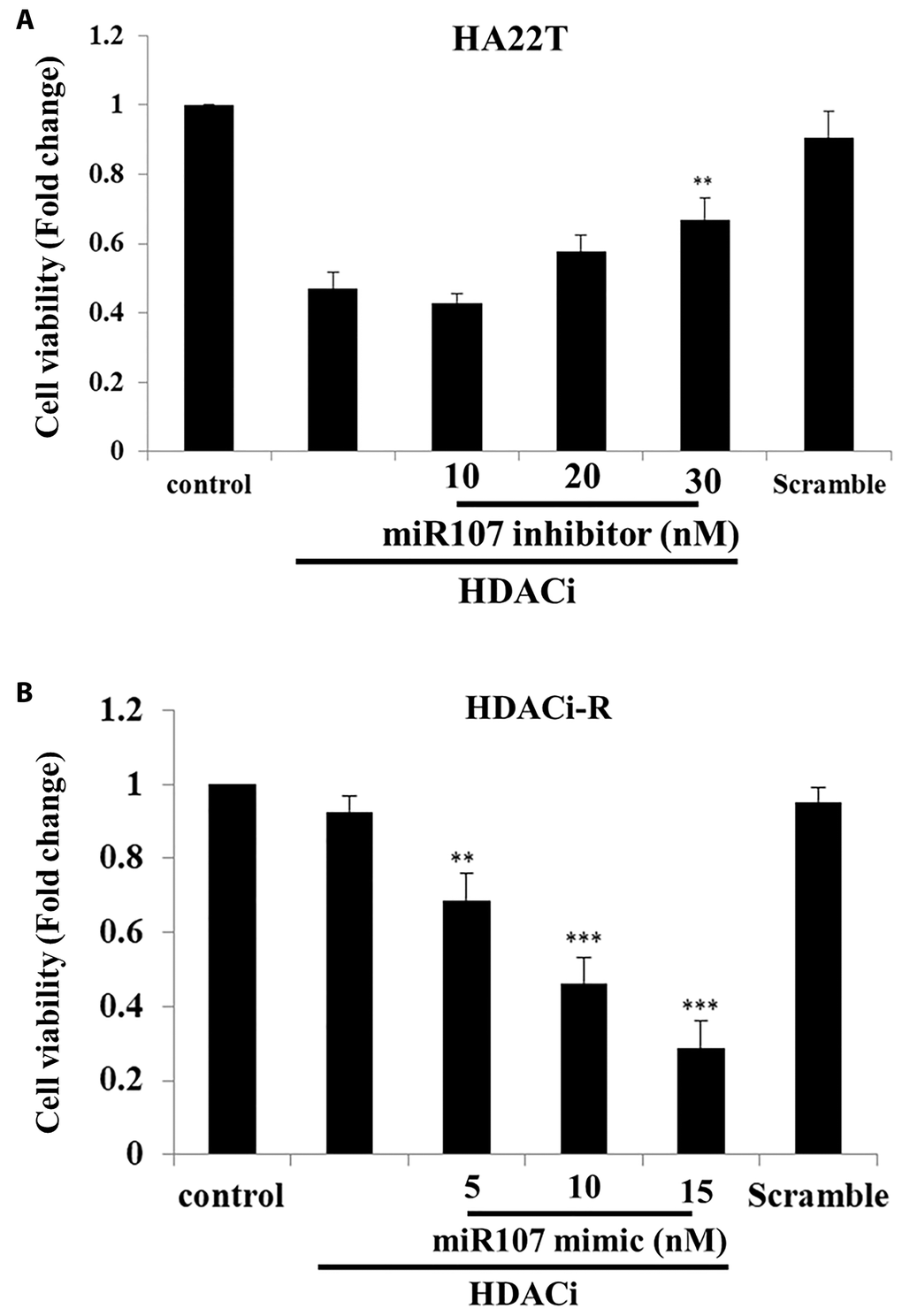 According to our previous results, expression of miR-107 downregulated pro-survival proteins expression in HDACi-R cells, and the upregulation of miR-107 led to increased apoptosis in HDACi-R HCC cells compared to that in parental cells. Next, we determined whether expression of miR-107 affects chemosensitivity in two liver cell lines. In Figure 3A, the MTT assay results indicated that HDACi (SAHA) decreased HA22T cell viability but knockdown of expression of miR-107 rescued HDACi-induced cell death in HA22T cells. Moreover, we confirmed that HDACi cannot induce cell death in HDACi-R cells but upregulation of miR-107 induced HDACi-R cellular sensitivity to HDACi in a dose-dependent manner (Figure 3B). These results indicate that miR-107 is highly correlated with chemosensitivity in HCC cells.