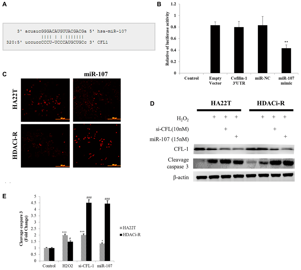Previous research has indicated that cofilin-1 leads to chemoresistance by affecting ROS accumulation in HCC cells [21]. Moreover, other studies have indicated that cofilin-1 is a direct target for miR-107 [31] in brain diseases. We then determined whether miR-107 induced cell death by regulating cofilin-1 expression and ROS accumulation. As shown in Figure 4A (predicted binding sites on microrna.org online database) and Figure 4B, the miR-107 binding sequence is located on the cofilin-1 3' UTR, as predicted by mircoRNA.org database. After co-transfecting HDACi-R cells with the cofilin-1 3' UTR reporter vector and miR-107 mimic, luciferase activity was found to be significantly reduced compared with the cofilin-1 3' UTR reporter vector alone. Next, we determined whether cell death induction by miR-107 was related to ROS accumulation. First, we observed that ROS accumulated in HA22T control group more than HDACi-R control group. Upregulated expression of miR-107 induced ROS accumulation in HDACi-R cells (Figure 4C). As presented in Figure 4D, ROS induced higher apoptosis- related protein expression (c-caspase-3, Figure 4E) in HA22T cells than HDACi-R cells. Further, upregulation of miR-107 decreased expression of cofilin-1 and enhanced ROS-induced cell apoptosis. We observed the same result after knockdown of cofilin-1 by siRNA also enhanced HDACi-R sensitivity to ROS (Figure 4D). Importantly, upregulation of miR-107 promoted ROS accumulation in both types of cells, especially in HDACi-R cells. These findings suggest that miR-107 inhibited cell viability through cofilin-1-mediated ROS accumulation in HCC cells.