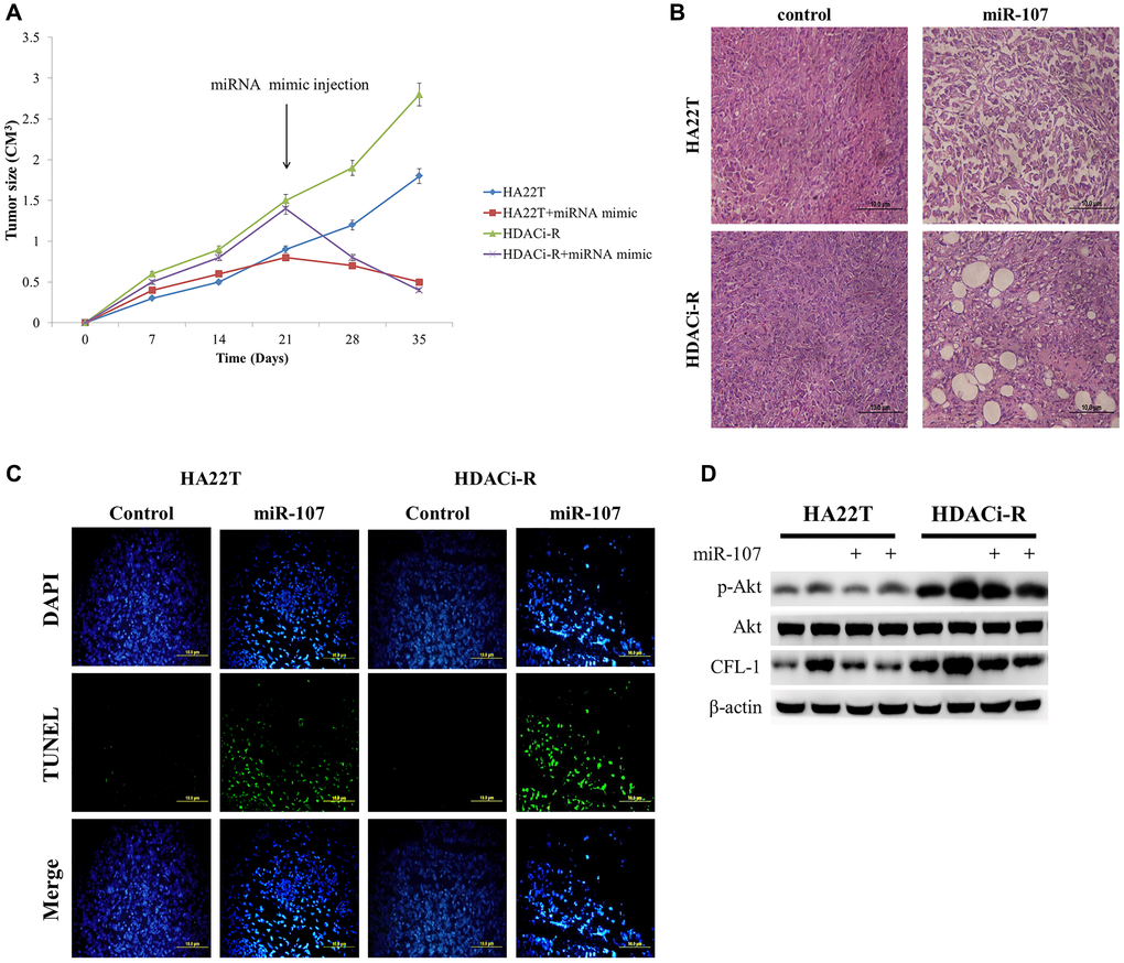 After verification of the role of miR-107 in two HCC cells, we confirmed whether miR-107 regulates HCC tumor growth in a nude mice model. HDACi-R tumor growth was faster than that of HA22T. After tumors were injected with miR-107, we observed significant inhibition of tumor growth, especially in HDACi-R cells (Figure 5A). Histological analysis of tissues sections by hematoxylin and eosin (H&E) staining showed that upregulation of miR-107 resulted in tumor cell disorganization and loss of nucleus in both HA22T and HDACi-R tumors by histological analysis (Figure 5B). These data indicate that miR-107 not only inhibited tumor growth but also induced tumor apoptosis. Next, we used TUNEL (terminal deoxynucleotidyl transferase dUTP nick end labeling) assay to double confirm that miR-107 induced tumor apoptosis. Figure 5C shows that upregulation of miR-107 induced cell apoptosis both in HA22T and HDACi-R tumors. Moreover, we also obtain that upregulation of miR-107 decreased survival protein (p-Akt) and CFL-1 expression both in two HCC tumors (Figure 5D). These findings indicate that miR-107 had an anti-tumor effect and in HCC.