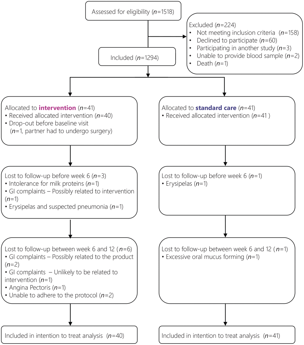 During follow-up, a total of 4 serious adverse events occurred, which were not related to treatment nor to study procedures. All serious adverse events (angina pectoris, erysipelas with suspected pneumonia, transient ischemic attack, volvulus) occurred in the novel supplement group, and the first two led to discontinuation of the participant. Adverse events were reported by 31 (77.5%) participants in the novel supplement group and 28 (68.3%) participants in the standard supplement group. A total of 55 adverse events were classified as gastro-intestinal complaints, which occurred in 42 participants (Table 5). Upper abdominal complaints, such as belching, heartburn and dyspepsia, were reported more often by participants in the standard supplement group (n=10, leading to drop-out in n=1) than in the novel supplement group (n=5). Side-effects related to defecation, mainly reported as diarrhoea, were observed more often in participants in the novel supplement group (n=21) than in the standard supplement group (n=7). In the novel supplement group, these complaints led to study discontinuation in 5 participants. The relation to the study product was evaluated by an independent physician and considered 'definite' in n=1 (intolerance for milk proteins which was not reported by the participant during screening), 'possible' in n=3 and 'unlikely' in n=1 of the participants who dropped out.