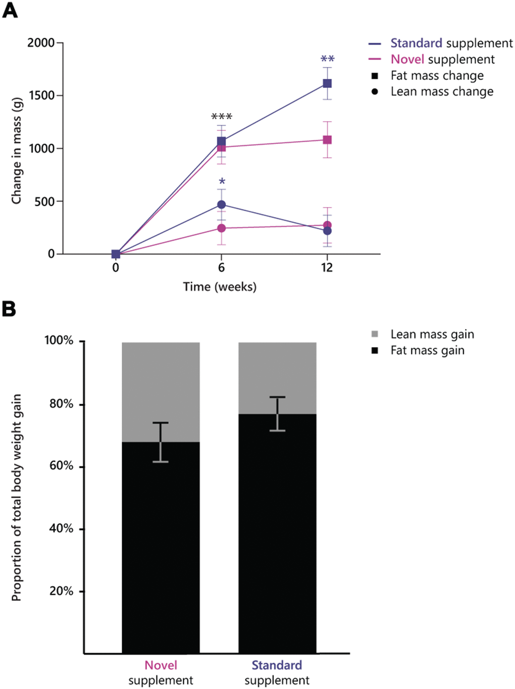 Self-measured body weight increased in a similar manner in both treatment arms (P-value for treatment x time interaction >.05), in the novel supplement group from 61.6 kg (95% CI, 59.3-63.8) to 63.2 kg (95% CI, 60.9-65.4) and in the standard supplement group from 62.1 kg (95% CI, 59.9-64.3) to 63.8 kg (95% CI, 61.6-66.0). No within, or between-group differences in total lean body mass or appendicular lean body mass were observed (time*treatment effects P>0.05, Figure 2A). Fat mass increased differentially between the two treatment arms (time*treatment effect P=0.045, Figure 2). The standard supplement group showed a larger increase in fat mass (from 13.3 kg, 95% CI, 11.2-15.4 to 14.9 kg, 95% CI, 12.8-17.0) than the novel supplement group (from 13.9 kg, 95% CI, 11.7-16.1 to 15.0 kg, 95% CI, 12.8-17.2). The proportion of fat mass gain as part of total weight gain was 87.7 % in the standard supplement group and 79.5 % (Figure 2B). Phase angle tended to increase more in the standard supplement group (from 4.7°, 95% CI, 4.5-4.9 to 4.9°, 95% CI, 4.7-5.1) than in the novel supplement group (from 4.8°, 95% CI, 4.6-5.0 to 4.9°, 95% CI, 4.7-5.1, treatment x time interaction P=0.07).