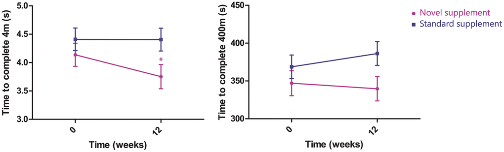 The performance on the walk tests of 400 m and 4 m changed differentially over the two treatments arms during the study period in favour of the novel supplement group (400m, treatment x time interaction P=0.038; 4m, treatment x time interaction P=0.048; Figure 3). Time needed to complete the 400 m walk test changed from 347 s (95% CI, 316-378) to 340 s (95% CI, 308-372) in the novel supplement group, and from 369 s (95% CI, 338-400) to 386 s (95% CI, 355-417) in the standard supplement group. Time needed to complete the 4 m walk test changed in the novel supplement group from 4.1 s (95% CI, 3.7-4.5) to 3.8 s (95% CI, 3.4-4.2), and in the standard supplement group from 4.4 s (95% CI, 4.0-4.8) to 4.4 s (95% CI, 4.0-4.8).
