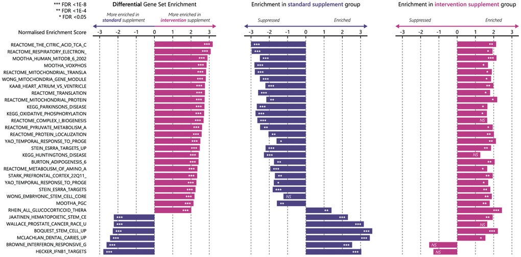 Microarray analysis was performed using MADMAX pipeline for statistical analysis of microarray data [24]. Quality control was performed, and all arrays met our criteria. For further analysis, a custom annotation was used based on reorganized oligonucleotide probes, which combines all individual probes for a gene [25]. Expression values were calculated using the robust multichip average (RMA) method, which includes quantile normalization [26]. Significant differences in expression were assessed using paired Intensity-Based Moderated T-statistic (IBMT [27]). Gene set enrichment analysis was performed with ClusterProfiler [28], based on ranked gene lists of three contrasts: Δ gene expression week 0 to week 12 in the standard supplement group, Δ gene expression week 0 to week 12 in the novel supplement group, and the Δ of these Δs to assess between-group differences over time. Overlaps in gene sets were calculated via the same method used in Migliavacca et al.: