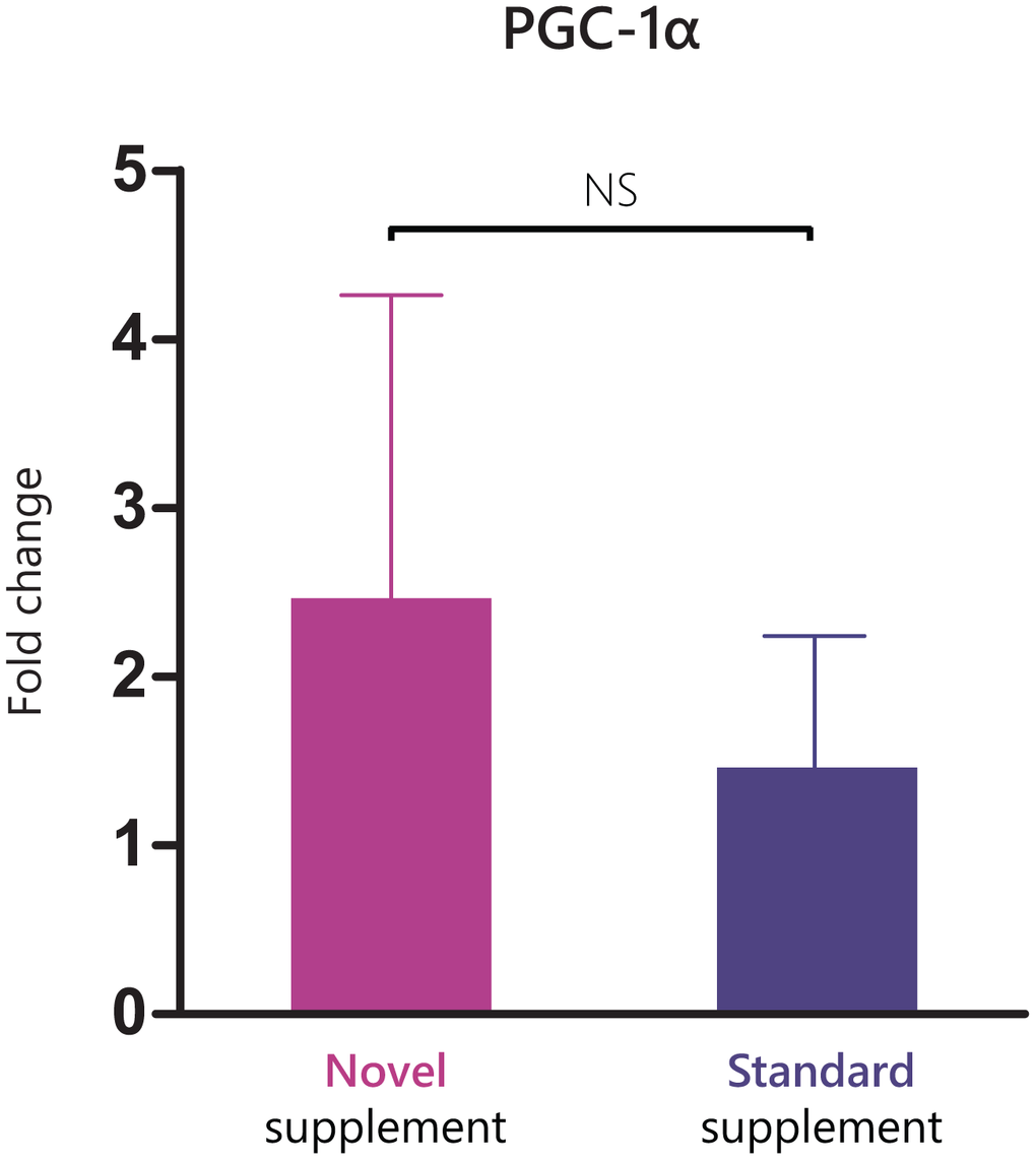 Of interest, Chen and colleagues showed that UA improved mitochondrial biogenesis via upregulation of activated AMPK, TFAM and PGC-1α in myotubes, and improved endurance in mice [18]. In the subsample of n=15 participants from which we successfully assessed protein expression via western blots, we found results that are in line with these findings. Whereas we observed increased activation of AMPK in both treatment arms, the indications of increased expression of PGC-1α was especially pronounced in the novel supplement group. TFAM was also upregulated in both treatment arms, but in this case, the expression was increased to a greater extent in the standard supplement group. Within-group upregulations of TFAM and PGC-1α were, however, not significant due to large variation. All in all, the potential of UA and of the intervention supplement on mitochondrial dynamics deserve attention in the future, as improving mitochondrial functioning might prove pivotal for the muscle functioning of older adults [47].