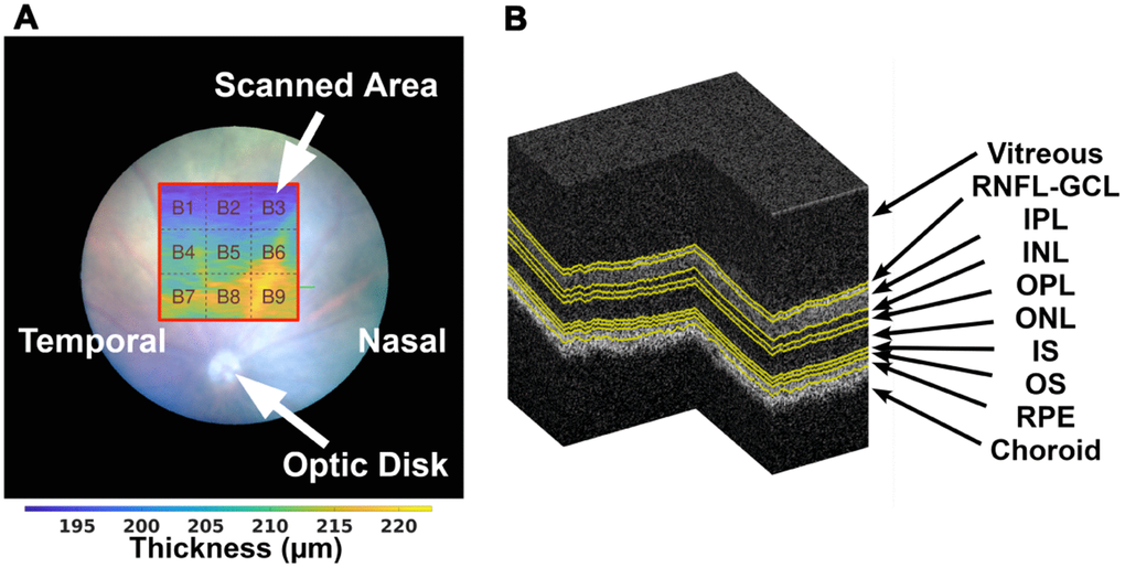 In this work, the OCT data is used for the segmentation of eight distinct layers, allowing the determination of the following: retinal nerve fibre layer and ganglion cell layer complex (RNFL-GCL), inner plexiform layer (IPL), inner nuclear layer (INL), outer plexiform layer (OPL), outer nuclear layer (ONL), the inner segment of the photoreceptors (IS), the outer segments of the photoreceptors (OS), and the retinal pigmented epithelium (RPE).