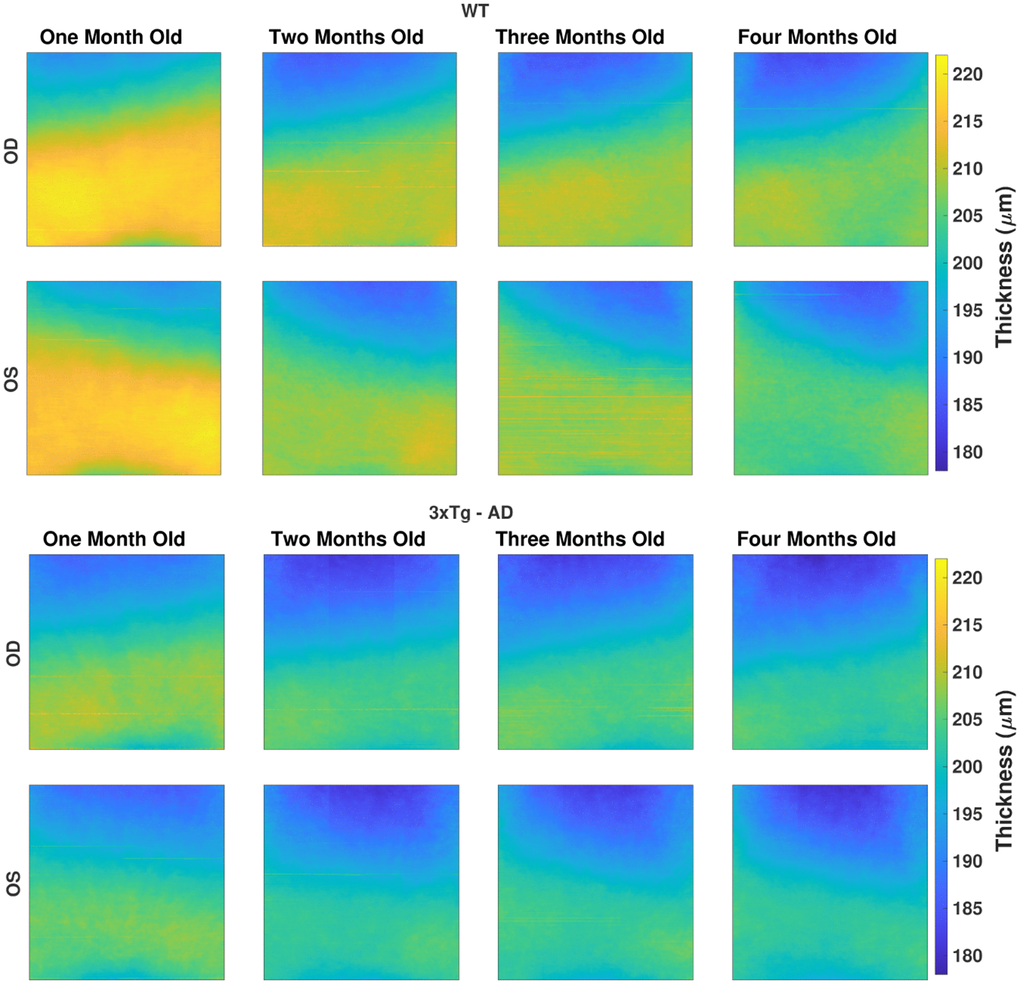 Detailed average thickness maps of 510×510 values were computed for the right and left-eyes per each retinal layer and the TRT. The latter is shown in pseudocolor in Figure 2, for WT and 3×Tg-AD groups, at each time point.