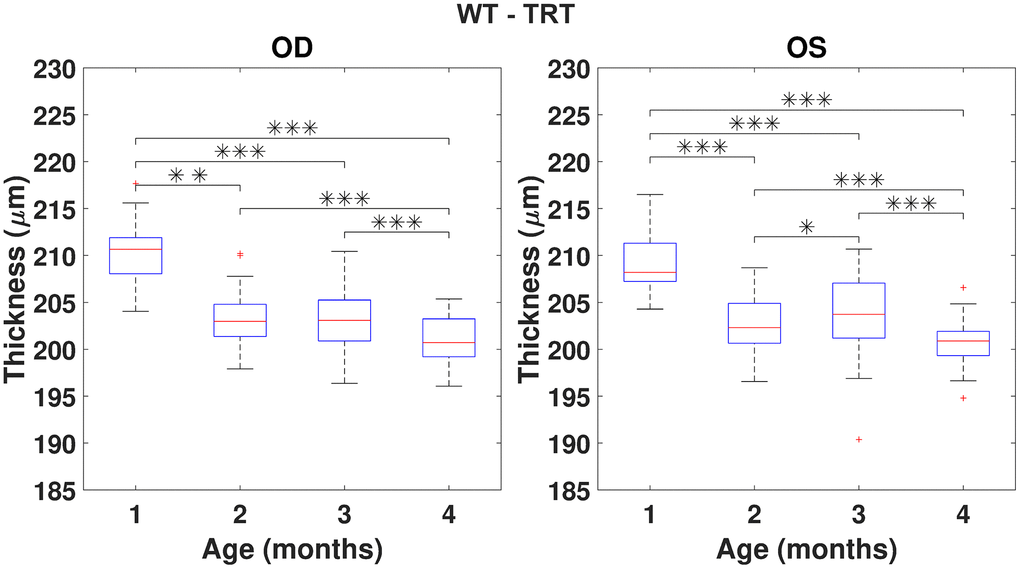 Statistically significant differences between groups can be found in Table 5 for both eyes. While the highest statistical differences were found for the IPL, INL, OPL, IS, RPE and the TRT, no differences were found for the ONL at any of the significance levels considered in this work. The RNFL-GCL complex showed statistically significant differences starting at the age of two-months-old on both eyes. On the other hand, the OS layer presents statistically significant differences at the age of one and four-months-old for both eyes.
