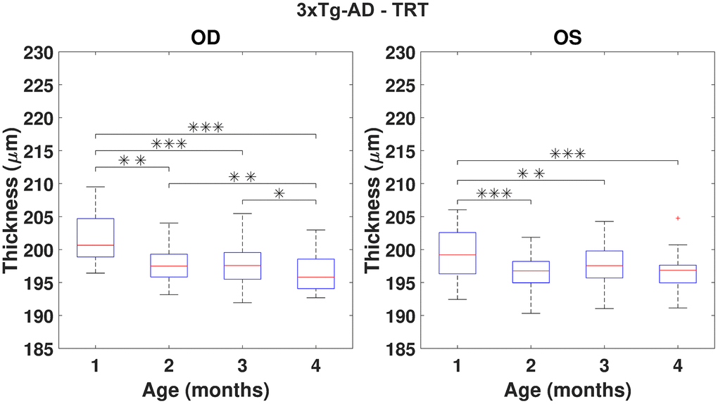Using the repeated measures ANOVA (RANOVA), the thickness distributions were compared across the four-time-points for each group/eye combinations. Only eyes successfully imaged and processed at all four-time-points (WT (N=37) and 3×Tg-AD (N=35)) were considered for this particular analysis. Achieved results show thickness to be dependent on age for the period covered in this study. Pairwise comparisons are illustrated in Figures 3, 4 for the TRT, respectively for the WT and 3×Tg-AD groups. Statistically significant differences were found between the first and remaining time points for all eyes. Also, except for the left-eye of the 3×Tg-AD group, all remaining eye present statistically significant differences between the four and all remaining time points. For detailed data, please refer to Supplementary Figures 1–16.