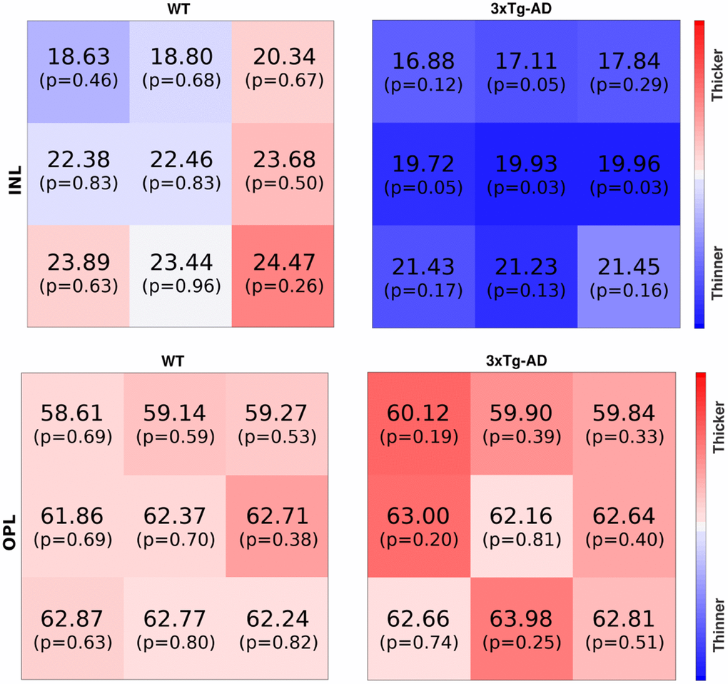 The intense blue color of the INL thickness of the 3×Tg-AD mice shown in Figure 5 indicates the overall decrease in thickness compared to the established normative data. Indeed, five out of the nine values present p-values under 0.1, meaning that the probability of randomly generating that or a more extreme thickness value for the normative distribution of the thickness is below 10%. On the other hand, for the WT thickness map, one can find both blueish and reddish colors, meaning that the thickness is around the average, respectively below and above it, with the light colors indicating these are close to the average; six of the nine values present a p-value above 0.6.