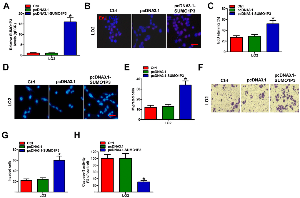 To address the effects of SUMO1P3 upregulation on normal liver cells, LO2 cells were untransfected (control) or transfected with pcDNA3.1-SUMO1P3 or pcDNA3.1 plasmids. As depicted in Figure 2A, pcDNA3.1-SUMO1P3 plasmid transfection markedly enhanced SUMO1P3 expression in LO2 cells compared with pcDNA3.1-transfected and control cells. SUMO1P3 overexpression promoted LO2 cell proliferation as shown by the elevated EdU incorporation (Figure 2B, 2C). Ectopic expression of SUMO1P3 dramatically increased the migration of LO2 cells compared with pcDNA3.1-transfected or control cells (Figure 2D, 2E). Similarly, cell invasion was markedly suppressed by SUMO1P3 knockdown (Figure 2F, 2G). Moreover, caspase-3 activity was reduced in serum-starved LO2 cells with SUMO1P3-overexpression (Figure 2H). These results illuminated that SUMO1P3 overexpression resulted in the malignant transition of normal liver cells.