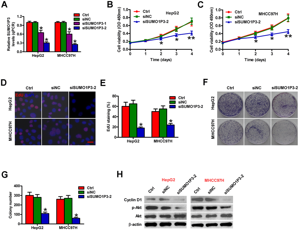 To determine the biological roles of SUMO1P3 in HCC cell proliferation, we used siRNA technology to knockdown SUMO1P3 expression in MHCC97H and HepG2 cells. Two sets of siRNA (siSUMO1P3-1 and siSUMO1P3-2) against SUMO1P3 were transfected into HCC cells. siSUMO1P3 transfection dramatically reduced SUMO1P3 level in MHCC97H and HepG2 cells compared to the siNC-transfected and control cells (Figure 3A). Because siSUMO1P3-2 has significantly higher silencing efficiency than siSUMO1P3-1, siSUMO1P3-2 is selected for all the subsequent experiments. SUMO1P3 knockdown reduced MHCC97H and HepG2 cell viability (Figure 3B, 3C). EdU incorporation experiment demonstrated that SUMO1P3 silencing inhibited MHCC97H and HepG2 cell proliferation (Figure 3D, 3E). Also, SUMO1P3 downregulation in MHCC97H and HepG2 cells lead to fewer and smaller colonies than siNC-transfected or control cells (Figure 3F, 3G). Mechanistically, SUMO1P3 depletion dramatically decreased cyclin D1 expression and Akt phosphorylation (Figure 3H). These data suggested that SUMO1P3 silencing decreases HCC cell proliferation in vitro.