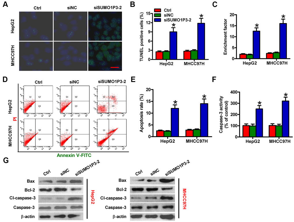 Next, the roles of SUMO1P3 were investigated in apoptosis of HCC cells. The results of TUNEL assay showed more apoptotic cells in siSUMO1P3-transfected MHCC97H and HepG2 cells than that in siNC-transfected or control cells (Figure 4A, 4B). DNA fragmentation assay showed notable increased apoptotic ratios of SUMO1P3-silenced MHCC97H and HepG2 cells (Figure 4C). Flow cytometry analysis demonstrated that SUMO1P3 knockdown markedly induced HCC cell apoptosis (Figure 4D, 4E). Moreover, caspase-3 activity was remarkably elevated in SUMO1P3-depleted MHCC97H and HepG2 cells (Figure 4F). To discover the underlying mechanisms on the contribution of SUMO1P3 to HCC cell apoptosis, Western blot was performed to determine the expression of Bax, Bcl-2, cl-caspase-3, and caspase-3. Depletion of SUMO1P3 resulted in the significant increase in Bax and cl-caspase-3 levels and decrease in Bcl-2 expression (Figure 4G). These findings indicated that SUMO1P3 knockdown increases HCC cell apoptosis in vitro.