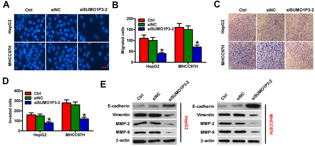To assess the roles of SUMO1P3 in HCC cell motility, Transwell assays were performed. SUMO1P3 silencing dramatically inhibited the migration of MHCC97H and HepG2 cells compared to siNC-transfected or control cells (Figure 5A, 5B). Similarly, cell invasion was markedly suppressed by SUMO1P3 knockdown (Figure 5C, 5D). To explore the underlying mechanism of the SUMO1P3-mediated motility in HCC cells, the expressions of E-cadherin, vimentin, MMP-2, and MMP-9, which are recognized as key molecules for cancer metastasis, were detected by Western blot. As expected, SUMO1P3 knockdown significantly decreased the levels of vimentin, MMP-2, and MMP-9 and increased E-cadherin expression in HCC cells (Figure 5E). These results suggested that SUMO1P3 depletion hampers migration and invasion of HCC cells in vitro.