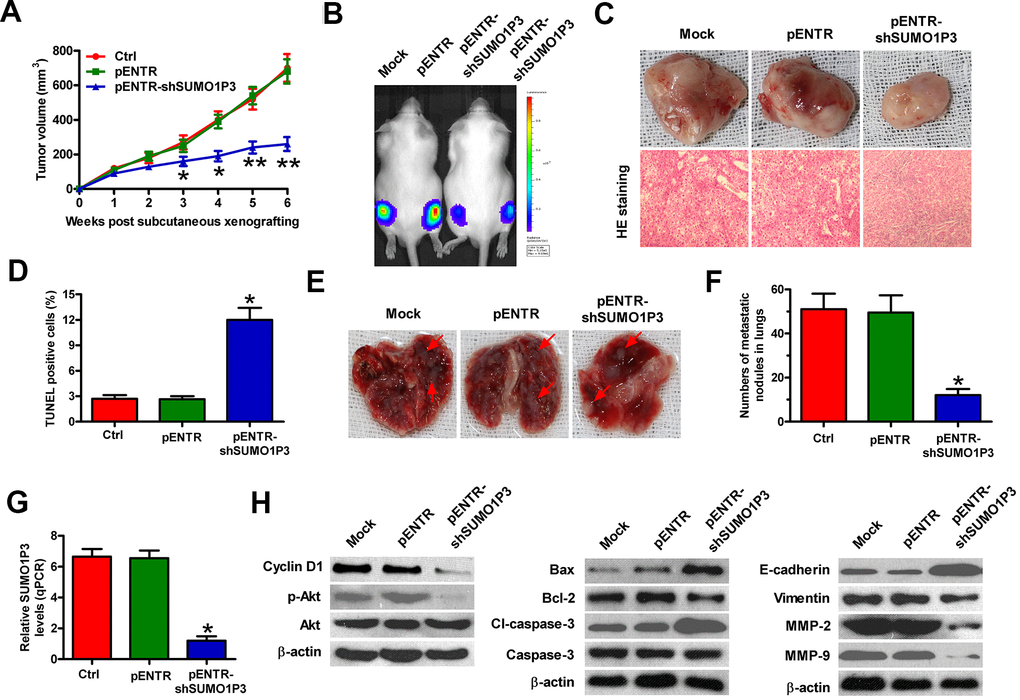To investigate the roles of SUMO1P3 in HCC growth and lung metastasis in vivo, heterotopic transplantation and metastatic models were established by subcutaneously or venously injecting with MHCC97H-luc cells stably expressing shSUMO1P3 or shNC. Compared with control or shNC group, SUMO1P3-depleted group exhibited significant reduction in tumor volume (Figure 6A). SUMO1P3-silenced mice showed slow tumor growth compared to the control or shNC-treated animals (Figure 6B, 6C). TUNEL-positive cells were much more in SUMO1P3-depleted tumors than those derived from control or shNC xenografts (Figure 6D). The metastatic nodules in the lungs were significantly reduced in the SUMO1P3-silenced group (Figure 6E, 6F). At the molecular level, SUMO1P3 depletion reduced SUMO1P3, cyclin D1, p-Akt, Bcl-2, cl-caspase-3, vimentin, MMP-2 levels, and MMP-9 but enhanced Bax and E-cadherin expression (Figure 6G, 6H). These results indicated that SUMO1P3 depletion hinders the growth and lung metastasis of HCC in vivo.