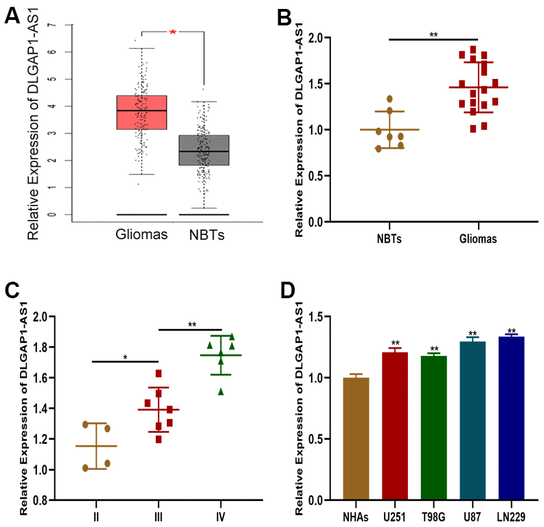 The GEPIA database was first searched to obtain further insights into DLGAP-AS1 expression in GBM (Figure 1A). DLGAP1-AS1 expression was then characterized using qRT-PCR in glioma tissues (n=17) and normal brain tissues (n=7). DLGAP1-AS1 was found to be more highly expressed in glioma tissues in contrast to healthy brain tissues (Figure 1B). These findings were similar to those extracted from the GEPIA database. Glioma grade was found to be associated to DLGAP1-AS1 was expression (Figure 1C). qRT-PCR analysis of DLGAP1-AS1 expression in three different glioma cell lines (U251, T98G, U87, and LN229) and NHAs found that the expression of this molecule was markedly raised in glioma cell lines in contrast to NHAs. This finding was particularly prominent in the LN229 and U87 cell lines (Figure 1D). Glioma development may be critically modulated by DLGAP1-AS1 expression.