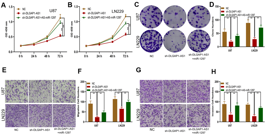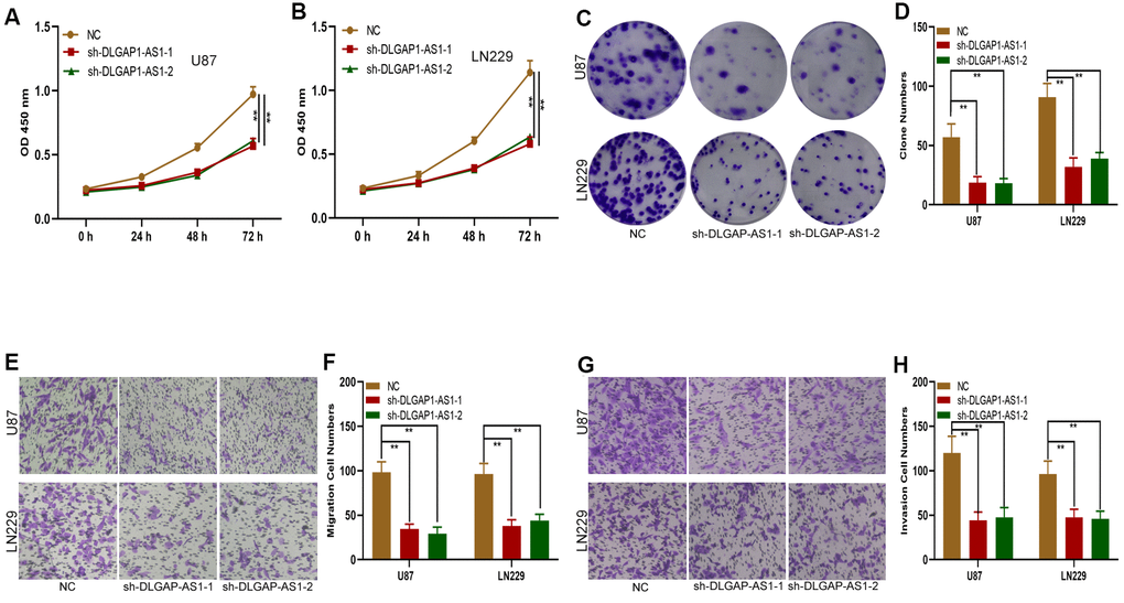 In order to determine the impact of DLGAP1-AS1 on glioma progression, we transfected shRNAs targeting DLGAP1-AS1 (sh-DLGAP1-AS1-1 and sh-DLGAP1-AS1-2) into LN229 and U87 cells. Transfection efficiency was validated using qRT-PCR (Supplementary Figure 1A, 1B). Subsequent CCK-8 assays demonstrated that knockdown of DLGAP1-AS1 notably inhibited the proliferative abilities of U87 and LN229 cells (Figure 2A, 2B). Consistent with the CCK-8 assay, knockdown of DLGAP1-AS1 resulted in smaller colony formation by both U87 and LN229 cells (Figure 2C, 2D). DLGAP1-AS1 silencing suppressed glioma cell invasion and migration, as demonstrated by transwell assays (Figure 2E, 2H). Our findings support the roles of DLGAP1-AS1 in regulating the invasive, migratory and proliferative abilities of glioma cells.