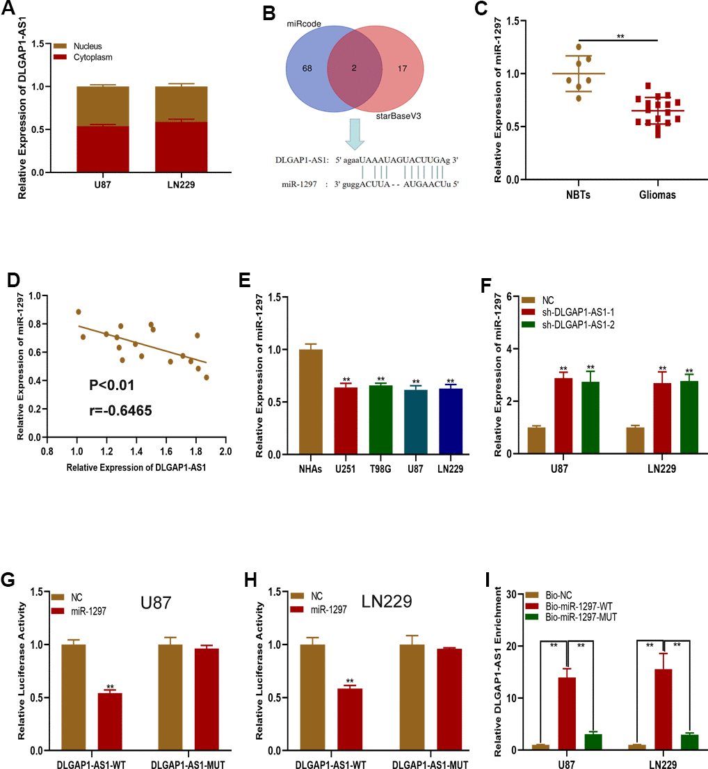 We then sought to characterize the underlying molecular mechanisms of DLGAP1-AS1 in glioma. A subcellular fractionation location assay found DLGAP1-AS1 to be primarily expressed in glioma cell cytoplasm (Figure 4A), highlighting the potential role of this molecule as a ceRNAs. Online bioinformatics databases (miRcode and starBase) were utilize to determine potential miRNAs of DLGAP1-AS1 target gene, with the miR-1297 being of special interest (Figure 4B). qRT-PCR showed that miR-1297 was more highly expressed in healthy brain samples in contrast to glioma tissues (Figure 4C). There appeared to be a negative correlation between DLGAP1-AS1 and miR-1297 in glioma tissues, as determined using Pearson correlation analysis (Figure 4D). miR-1297 quantification in glioma and NHAs found that it was of lower expression in glioma cell lines (Figure 4E). Interestingly, raised miR-1297 expression was characterized in U87 and LN229 cells transfected with sh-DLGAP1-AS1 (Figure 4F). Moreover, miR-1297 mimic transfection into the U87 and LN229 cells suppressed DLGAP1-AS1-WT luciferase activities, but not those of DLGAP1-AS1-MUT (Figure 4G, 4H). An RNA pull-down assays revealed that biotagged wild-type DLGAP1-AS1 possessed high expressions of miR-1297, findings which were not seen in biotagged mutant-type DLGAP1-AS1 and empty vectors (Figure 4I). The above findings suggested that DLGAP1-AS1 could sponge miR-1297.