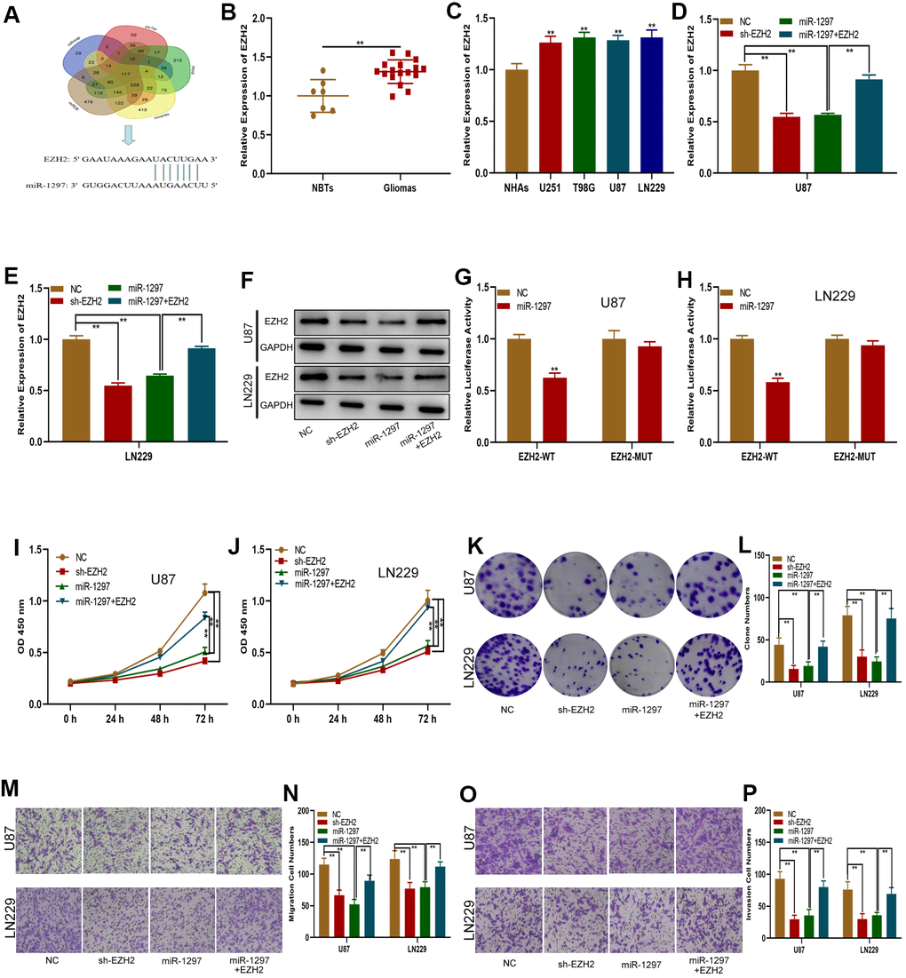 To verify this ceRNA hypothesis, we first sought to determine the miR-1297 target gene. Online database searches revealed EZH2 to be a downstream target gene of miR-1297 (Figure 5A). EZH2 possessed raised expressions in glioma tissues and cells in comparison to NHAs and normal brain tissues, as shown by qRT-PCR analysis (Figure 5B, 5C). EZH2 expression was detected in glioma cells transfected with sh-EZH2, miR-1297 mimics or miR-1297 mimics in combination with the EZH2 plasmid (Figure 5D–5F). Both sh-EZH2 and miR-1297 mimics suppressed EZH2 expression, with exposure to the EZH2 plasmid partially reversing the inhibitory impact of miR-1297 mimics. In addition, luciferase reporter assays revealed that luciferase activity of EZH2-WT was inhibited by miR-1297, however, no effects was observed in EZH2-MUT (Figure 5G, 5H). Our findings highlight that EZH2 may function as the target gene of miR-1297. Additional, transwell, colony formation, and CCK-8 assays were performed and revealed that the impact of miR-1297 mimics on glioma cell invasion, migration and proliferation was reversed upon exposure to the EZH2 plasmid (Figure 5I–5P). In summary, miR-1297 appeared to inhibit the invasive, migratory and proliferative capabilities of glioma cells through its action on EZH2.