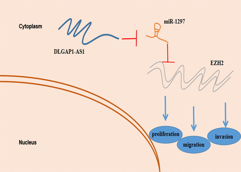 Our study, for the first time, depicts DLGAP1-AS1 as a crucial oncogenic protein in glioma. DLGAP1-AS1 promoted glioma progression through miR-1297 sponging and EZH2 regulation (Figure 7). Our study highlights the existence of a novel biological axis involved in glioma which could serve as the basis for formulation of more advanced diagnostic and therapeutic methods.