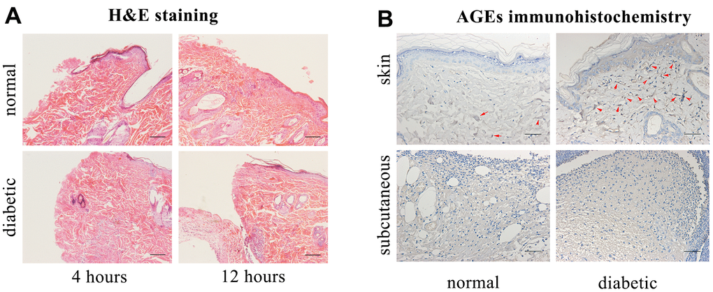 Hematoxylin and eosin (H&E) staining revealed that the inflammatory belt formed at 4 h post-injury in control rat skin tissue and at 12 h post-injury in diabetic rat skin tissue (Figure 1A).