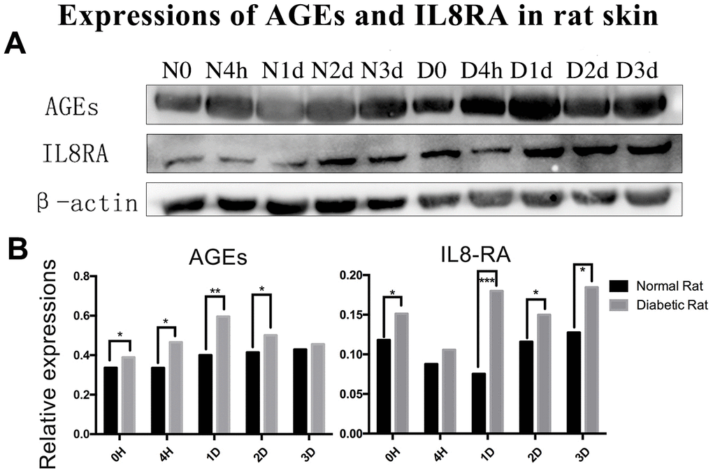 Western blotting to measure AGEs and IL8RA concentrations in diabetic and normal rat skin tissues