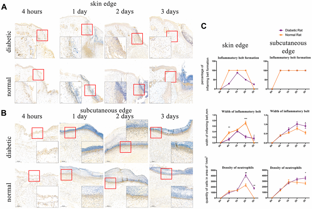Although multiple studies have demonstrated that the infiltration of inflammatory cells (e.g., macrophages and neutrophils) is delayed in diabetic wounds, few studies have described the exact time points of delayed neutrophil infiltration and its profiles. We found that the formation of the inflammatory belt in diabetic rats was delayed (12 h) as compared with that in the control rats, and the width of the inflammatory belt on the edge of skin in the diabetic rats was decreased as compared with that in control rats. We initially hypothesized that there may be an obstacle preventing the aggregation and chemotaxis of neutrophils in diabetic wound. However, we observed a large number of neutrophils in the subcutaneous tissue of the wound edge of diabetic skin; therefore, this hypothesis was rejected. Studies have shown that the deficiency of neutrophils accelerated the process of wound repair in the sterile wound [23]. In our study, we found that the LTB4 protein, which is essential in neutrophil migration [15], and the activity level of MPO, which is related to the number and activity of neutrophils, in diabetic wound tissue continued to increase. Sterile wounds are difficult to locate in general, and the abnormal function and mass aggregation of neutrophils in diabetic rat skin may represent an obstacle to wound repair in this matter.